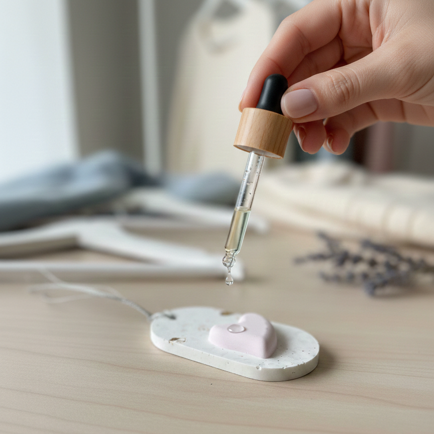 Добави 3–5 капки 100% чисто етерично масло върху дифузера или го напръскай с любим парфюм и го постави в гардероб или чекмедже. Освежавай аромата при нужда. Ако искаш да смениш аромата, просто изчакай няколко дни.